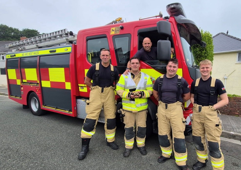Firefighters from Pembroke Dock Fire Station recently rescued Sheldon the tortoise, after a heating lamp in his enclosure caused a fire.