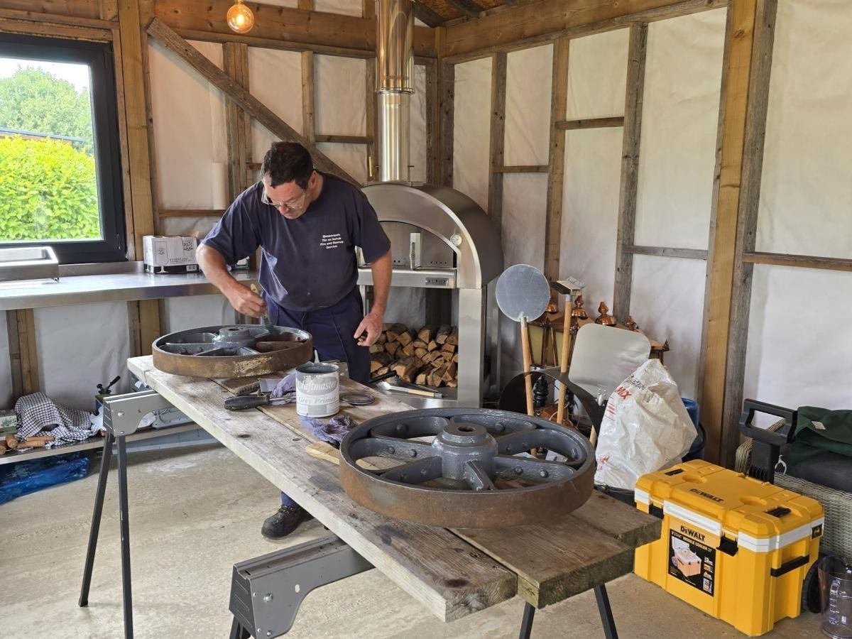The restoration work was undertaken by former MAWWFRS officer, Rob Rayner, who has an interest in restoring and displaying vintage vehicles. The restoration process took approximately four months to complete and involved stripping out the component parts of the pump and removing the paintwork to expose the galvanised metal bodywork. The metal components required priming and repainting, the brass elements were polished, the internal and external bodywork of the pump were repainted and wooden components that had deteriorated were replaced.
