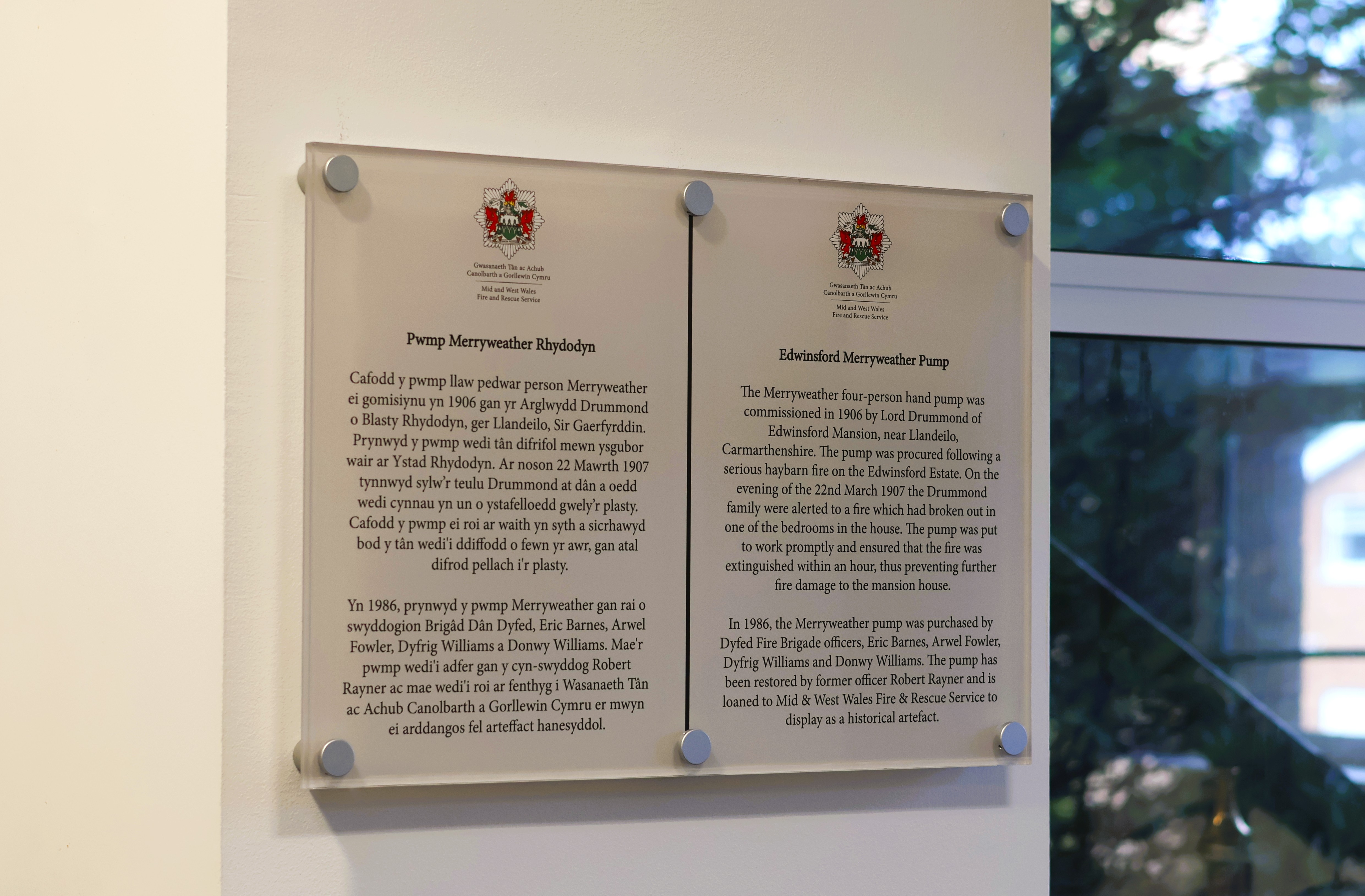 “We are delighted to display the newly refurbished Edwinsford Merryweather Pump at our Headquarters in Carmarthen. The pump has been lovingly restored and represents an important reminder of our firefighting heritage in the Carmarthenshire area.”